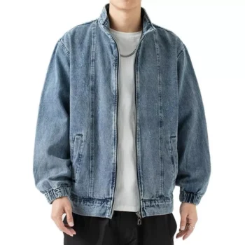 Men’s Stand Collar Denim Jacket – Casual Retro Zip-Up Outerwear