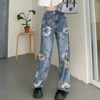 High-Waist Flower Embroidered Baggy Jeans for Women
