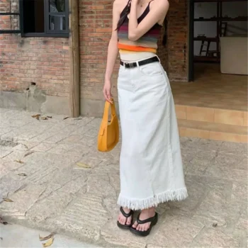 Spring-Summer Casual Tassel Maxi Denim Skirt – High Waist & Pockets