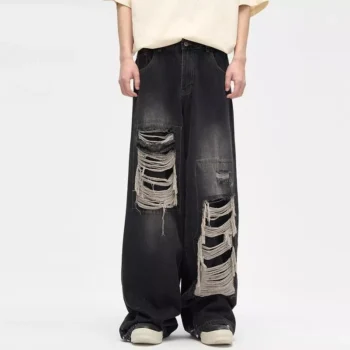 Men’s Distressed Wide Leg Black Jeans – Casual Ankle-Length Y2K & Korean Style Denim