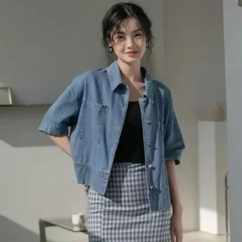 Women’s Vintage Cropped Denim Shirt – Summer Chic Short Sleeve Top