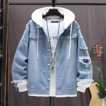 Men’s Hooded Denim Jacket – Fashionable Patchwork Design for Spring & Autumn