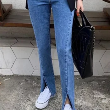 Summer Streetwear Denim Pencil Jeans – Mid Waist Split Front Skinny Trousers