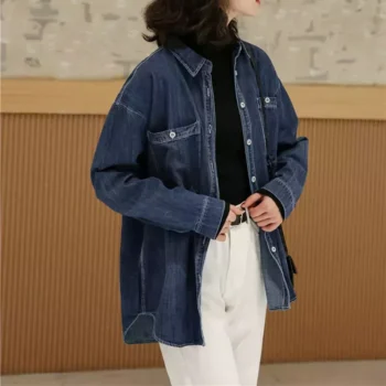 Chic Dark Blue Denim Shirt for Women – Spring Full Sleeve Loose Retro Jacket