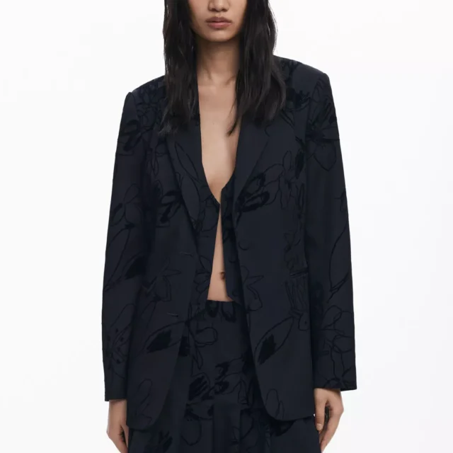 This isn’t just another black blazer—it’s a wearable piece of art. The Desigual Velvet Blazer is ideal for women who appreciate clothing that speaks volumes through detail and design. Wear it to the office to show off your creative edge or dress it up with heels and accessories for evening events. Pair it with tailored pants or denim—this blazer elevates every outfit. Don’t miss the chance to own a truly original piece that blends comfort, sustainability, and standout style. Add it to your wardrobe today and make your mark this season.