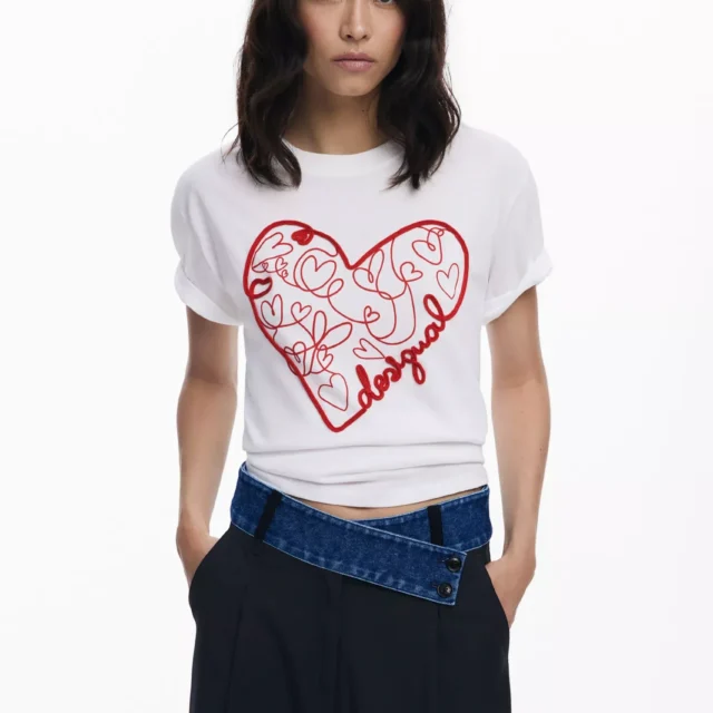 Bring charm and creativity to your everyday wardrobe with the Desigual Women’s White T-Shirt with Embossed Hearts. This isn’t your average tee—it’s a statement of joy and individuality. Featuring a clean white backdrop, this short-sleeve shirt shines with 3D embroidered cord details and printed heart silhouettes that add depth and personality to a classic silhouette. Designed for comfort and crafted with care, this top captures Desigual’s signature artistic spirit in a soft, wearable piece perfect for daily styling.