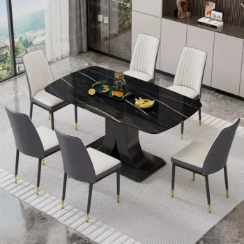 Modern Dining Table Set for 6 with Marble Top and Leather Chairs