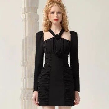Elegant Black Mini Dress with Square Neck and Floral Design for Autumn
