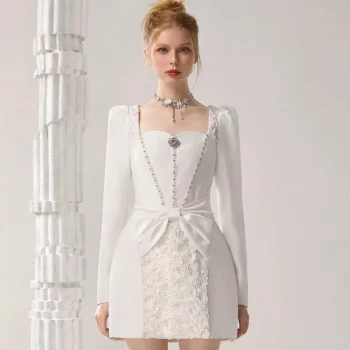 Romantic White Mini Dress with Bow and Square Neckline for Autumn Elegance