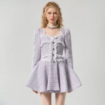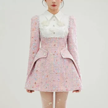 Romantic Tweed Short Dress with Beaded Pink Floral Design