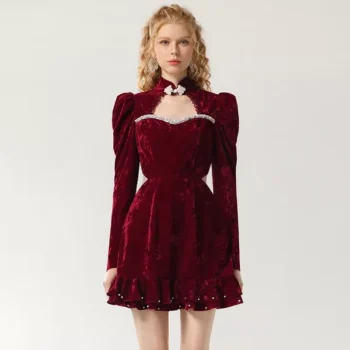Elegant Court-Style Velvet Cheongsam Dress with Beaded and Feather Details