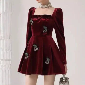 Elegant French Burgundy Velvet Long-Sleeve Banquet Dress for Autumn