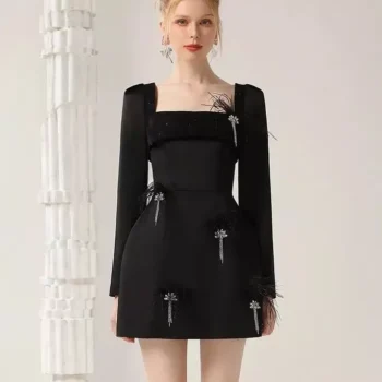 Elegant Black Feather Lace Dress with Beaded Details for Autumn 2024