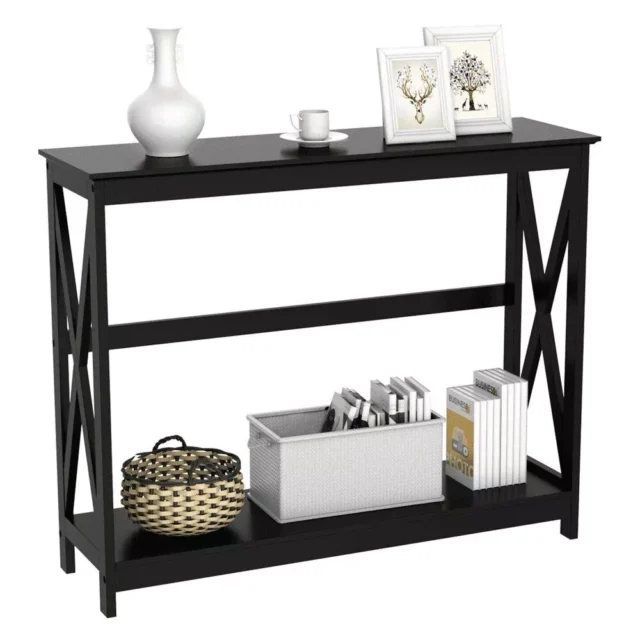 Elegant 2-Tier Black Wood Console Table with X Design and Storage Shelf