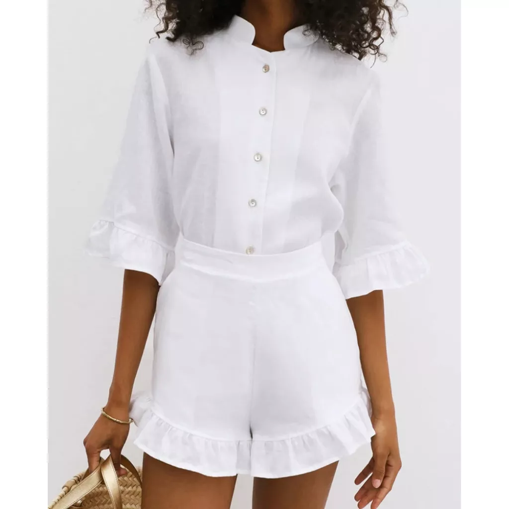 This 2-piece set features a half-sleeve shirt with a stand collar and a pair of high-waist ruffle shorts. The woven cotton fabric is breathable and lightweight, perfect for those hot summer days. The loose fit provides freedom of movement while the non-stretch material maintains its shape, giving you a polished look effortlessly.