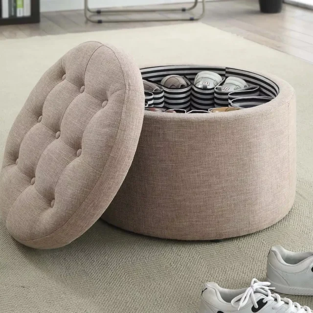 Elegant Tan Fabric Round Ottoman with Shoe Storage and Removable Lid