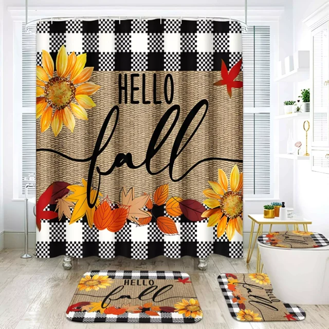 Welcome fall into your home with this charming 4-piece bathroom set featuring a stylish sunflower and buffalo check design. Perfect for creating a warm, seasonal atmosphere, this complete set includes everything you need to transform your bathroom into an autumn retreat – from a waterproof shower curtain to ultra-soft rugs.