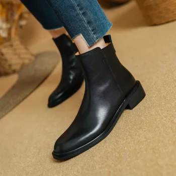 Genuine Leather Retro Round Toe Zipper Chelsea Ankle Boots for Women