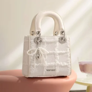 Mini Diamond Lattice Print Shoulder Bag with Bow Charm – Cute Small Square Bag for Women