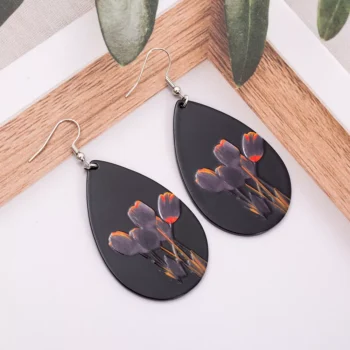 Vintage Tulip Flower Drop Earrings – Black Acrylic Lightweight Statement Jewelry