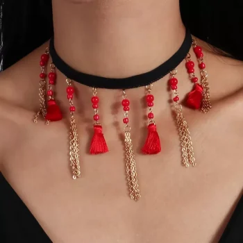 Red Black Velvet Lace Tassel Choker Necklace for Women – Boho Party Jewelry