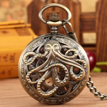 Vintage Bronze Mechanical Pocket Watch with Chain – Hollow Design