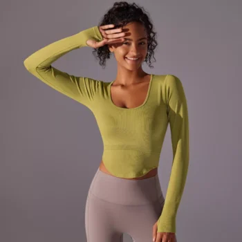 Seamless Yoga Shirt with Fixed Chest Pad and Long Sleeves – Fitness & Training Top