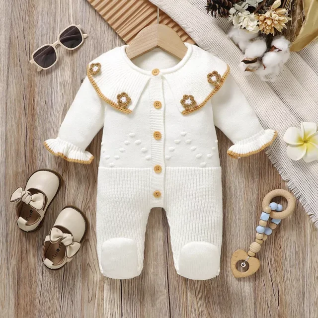 Dress your baby girl in this adorably warm romper that combines comfort with timeless style. Perfect for newborns up to 9 months, this footed jumpsuit features a delicate Peter Pan collar and soft acrylic knit fabric that keeps your little one snug as a bug. The floral detailing and footed design make it perfect for chilly autumn days while looking picture-perfect for special moments.