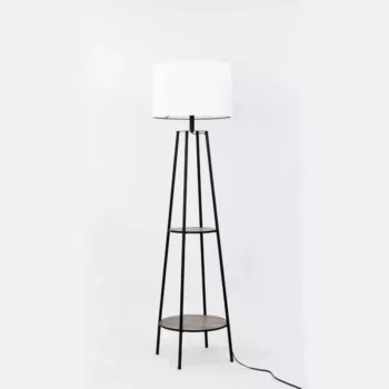 Elegant Black Floor Lamp with Wooden Shelves and LED Bulb