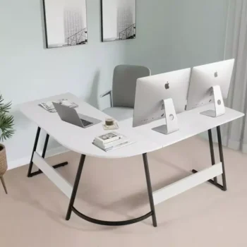 Sleek White L-Shape Home Office Computer Desk with Movable Monitor Stand