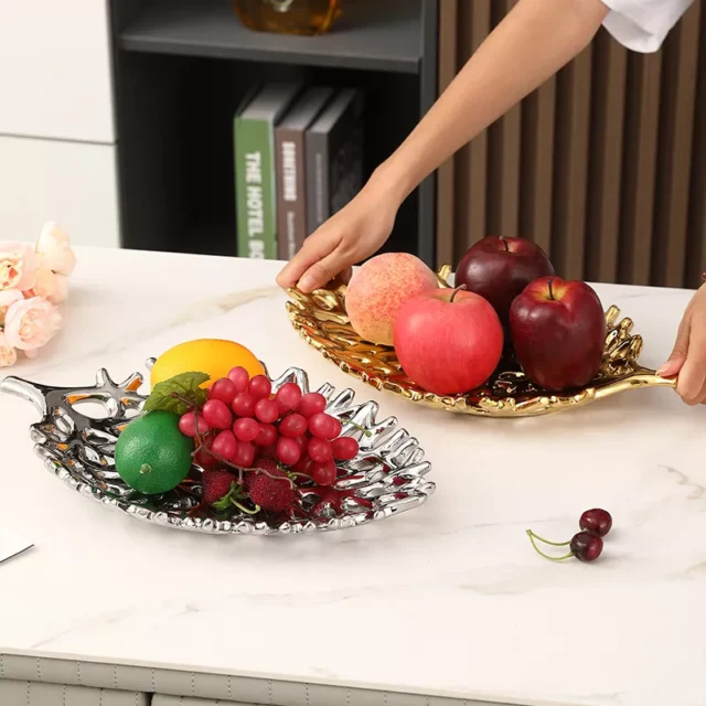 The Golden Leaf Fruit Plate is versatile and can be used in multiple ways. Place it on your dining table filled with fresh fruit to welcome guests, use it on a coffee table as a stylish storage solution for keys and trinkets, or let it shine as a standalone decorative piece in your living room or entryway. It’s also ideal for festive gatherings, family dinners, or as an elegant décor accent all year round.