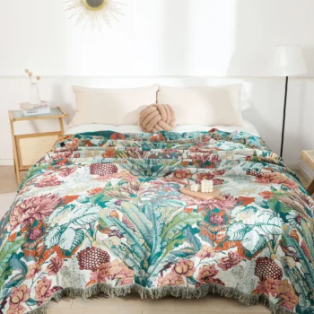 Floral Cotton Gauze Towel Blanket with Tassels – Soft Bedspread & Sofa Cover