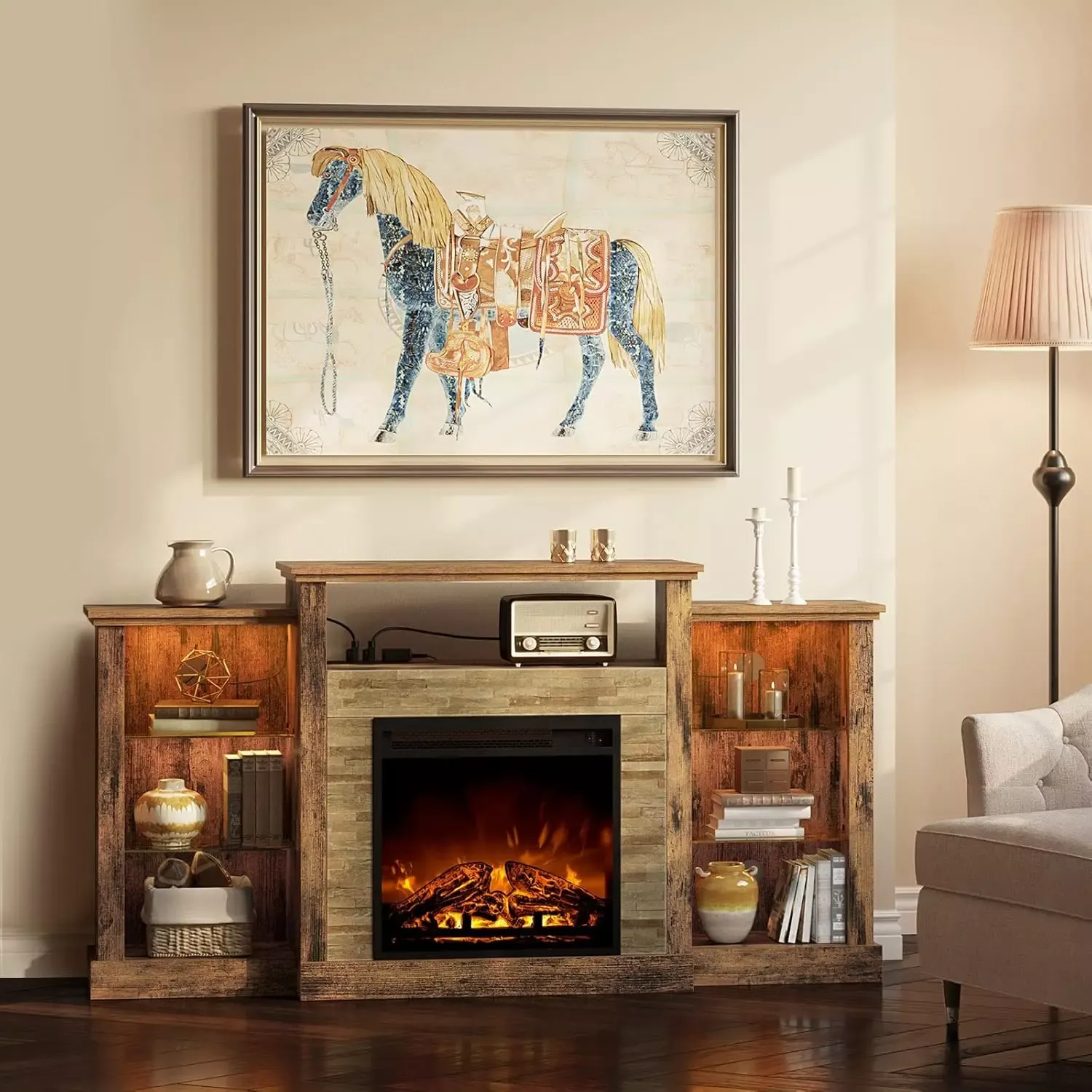 Fireplace TV Stand with LED Lights for TVs up to 65″ – Entertainment Center with Adjustable Glass Shelves, Power Outlets, and Rustic Brown Finish