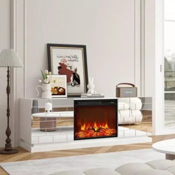 Mirrored Media Console with Electric Fireplace and Sliding Doors