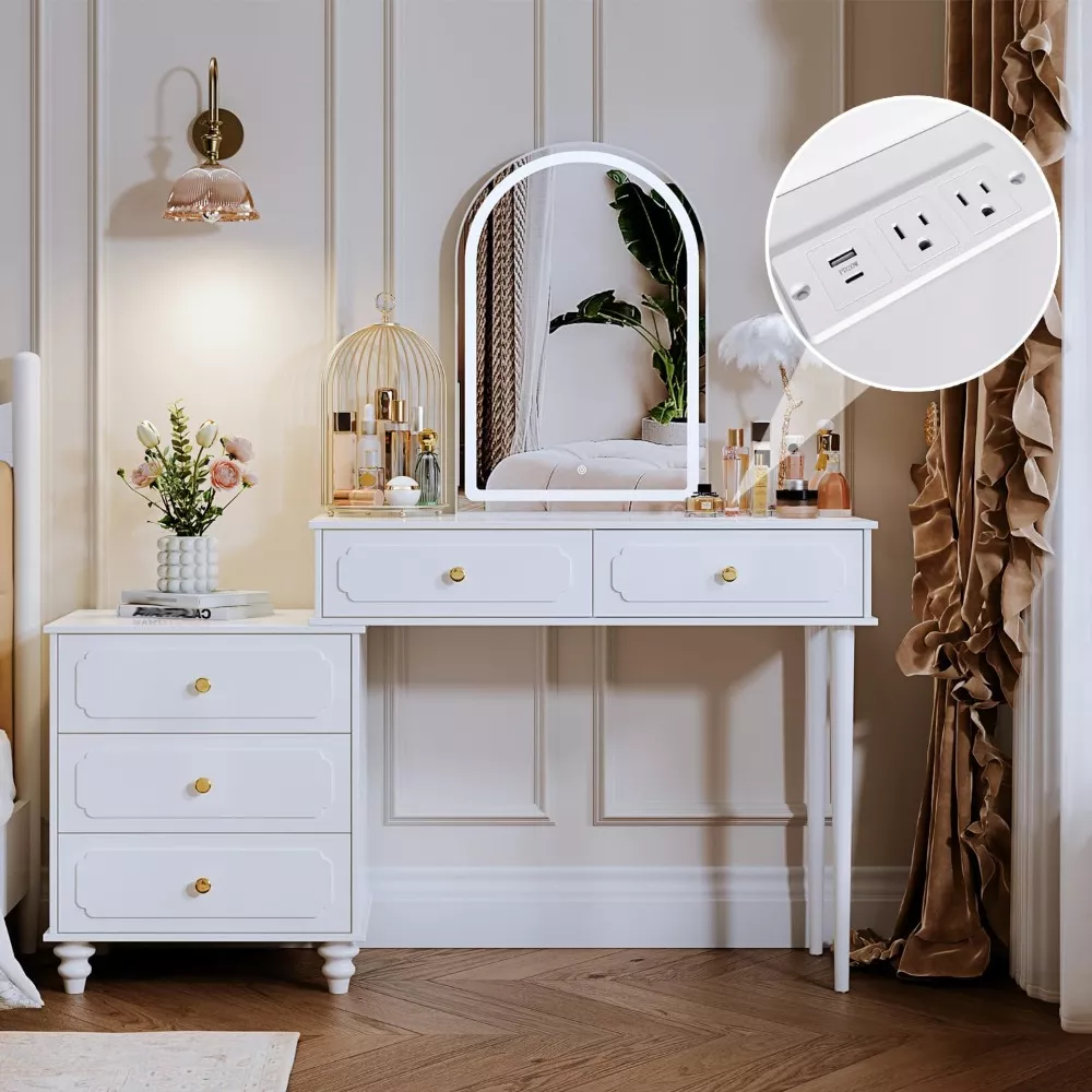 Modern Vanity Desk with Mirror, Lights & Power Outlet