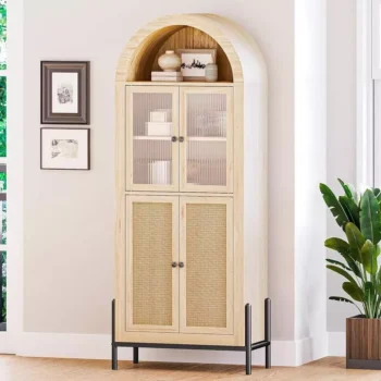 72″ Arched Storage Cabinet with Beech-Rattan Door, Adjustable Shelf Wooden Bookcase