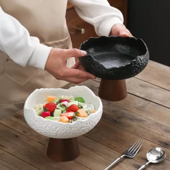 Elegant Ceramic Tall Leg Fruit & Dessert Plate – Black & White Frosted