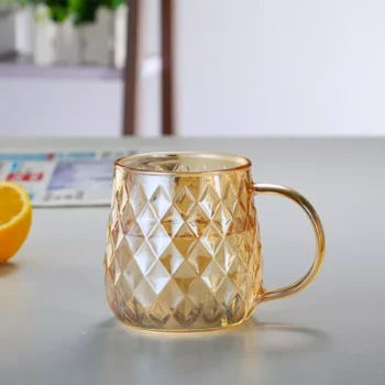 Diamond Textured Glass Mug with Handle – Golden 13oz Teacup for Hot & Cold Drinks 1 Pc