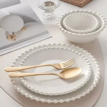 Ceramic Tableware Set with Nordic Pearl Beaded Edge – Plates & Bowls