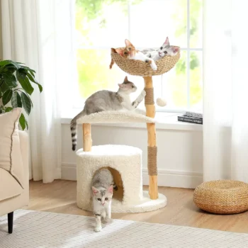 Modern Wooden Cat Tree Tower with Wicker Basket and Cozy Condo