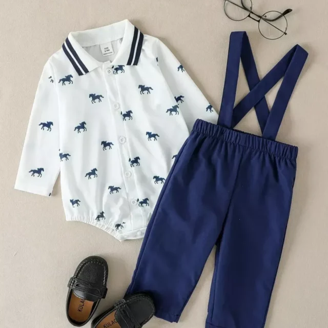 Dress your little boy in style with this adorable horse print overall set. Designed for both comfort and elegance, this outfit is the ideal choice for family gatherings, birthday parties, and even casual daily wear. With its gentleman-inspired design and playful horse print, it strikes the perfect balance between fun and formal. Your little one will look handsome and feel comfortable all day long.