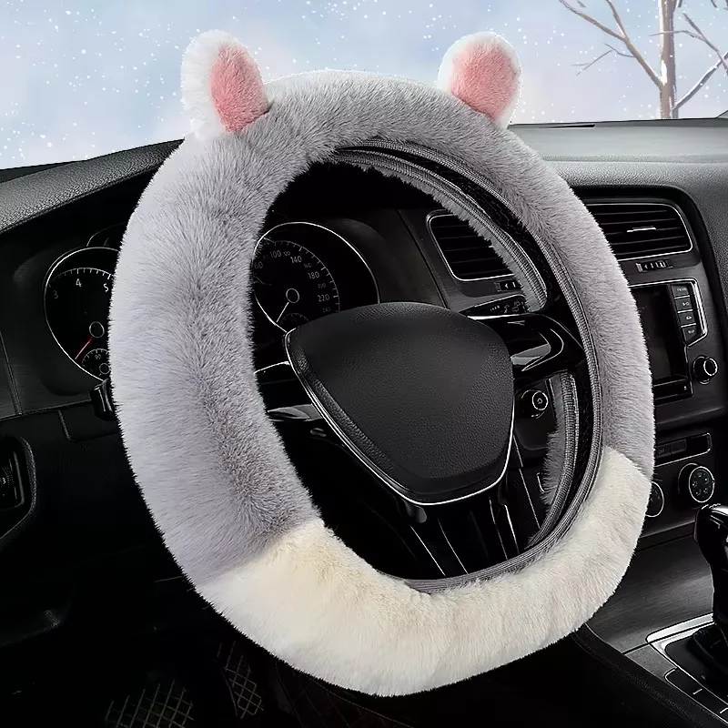 Two-Tone Plush Rabbit Steering Wheel Cover – Cute Winter Non-Slip Design