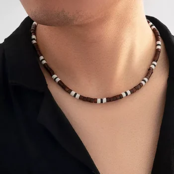 Men’s Tribal Wooden Beaded Clay Necklace – Vintage Surfer Beach Jewelry