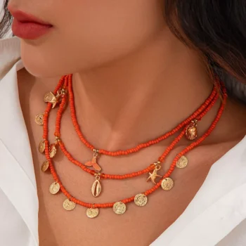 Boho Orange Beaded Layered Necklace Set with Starfish & Conch Pendants