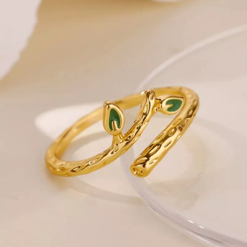 18K Gold Plated Green Leaf Adjustable Ring for Women