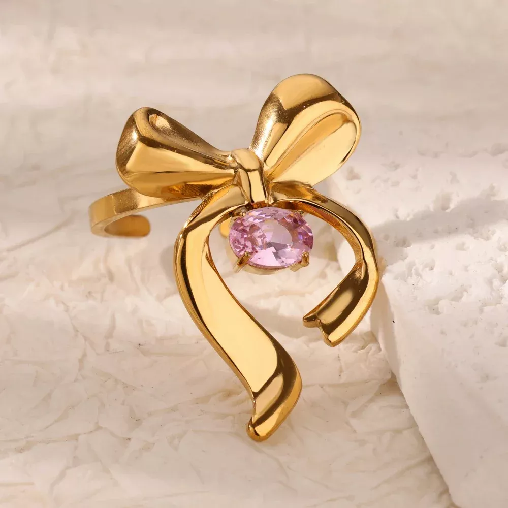 Pink Zircon Bow Tie Ring for Women – Gold Stainless Steel Fashion Jewelry