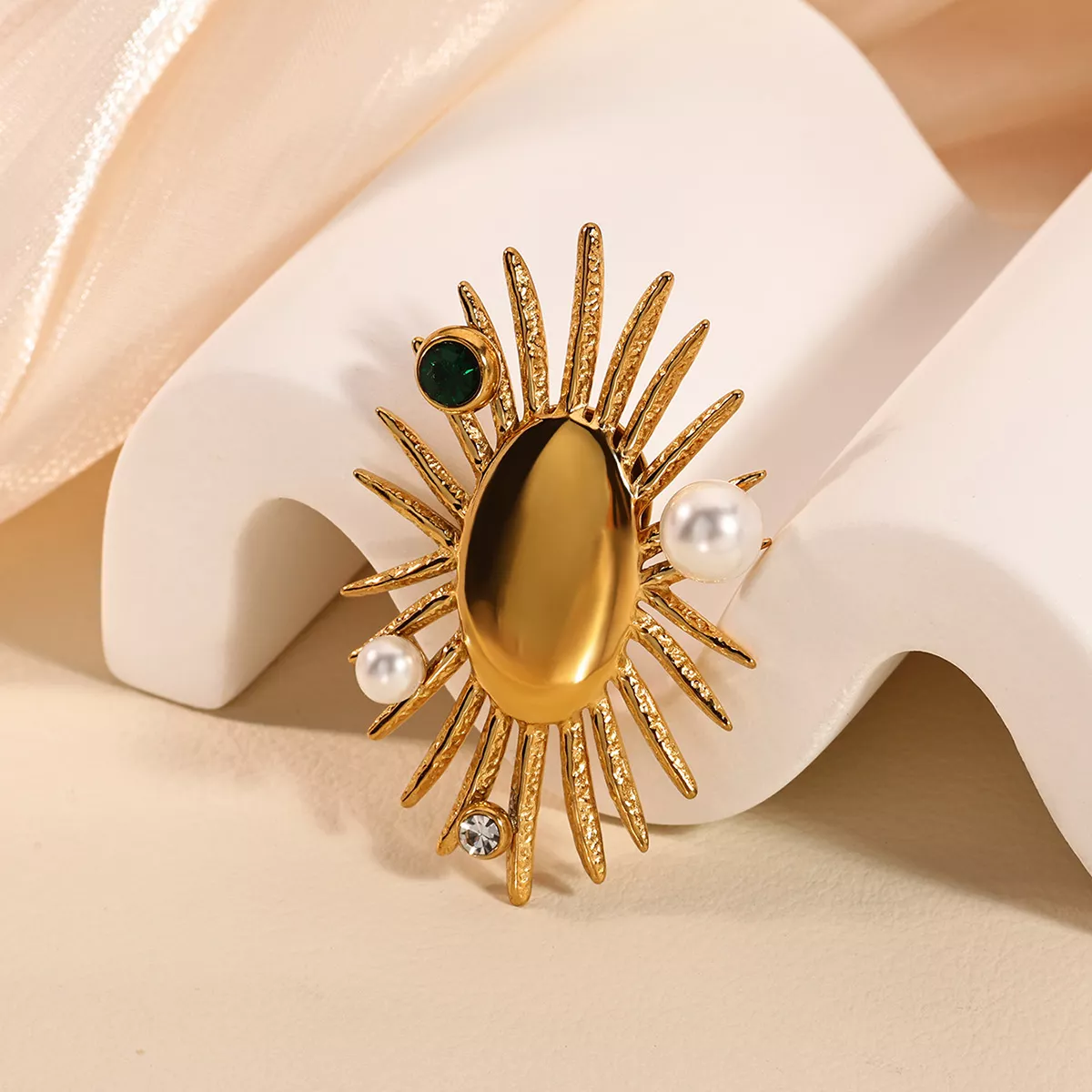 Stainless Steel Sun Flame Brooch with Gold Color, Pearl & Zircon for Women and Men