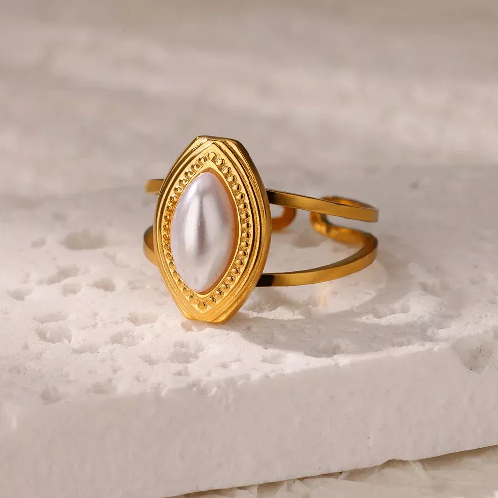 Imitation Pearl Oval Ring for Women – Gold Stainless Steel Geometric Engagement Ring