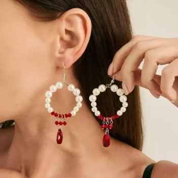 Blood Red Crystal Tassel Drop Earrings with Vintage Pearl Detail