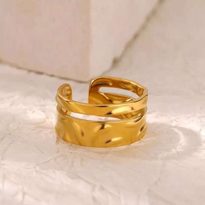 Gold Stainless Steel Double Layer Hollow Open Ring for Women – Trendy Wedding Band